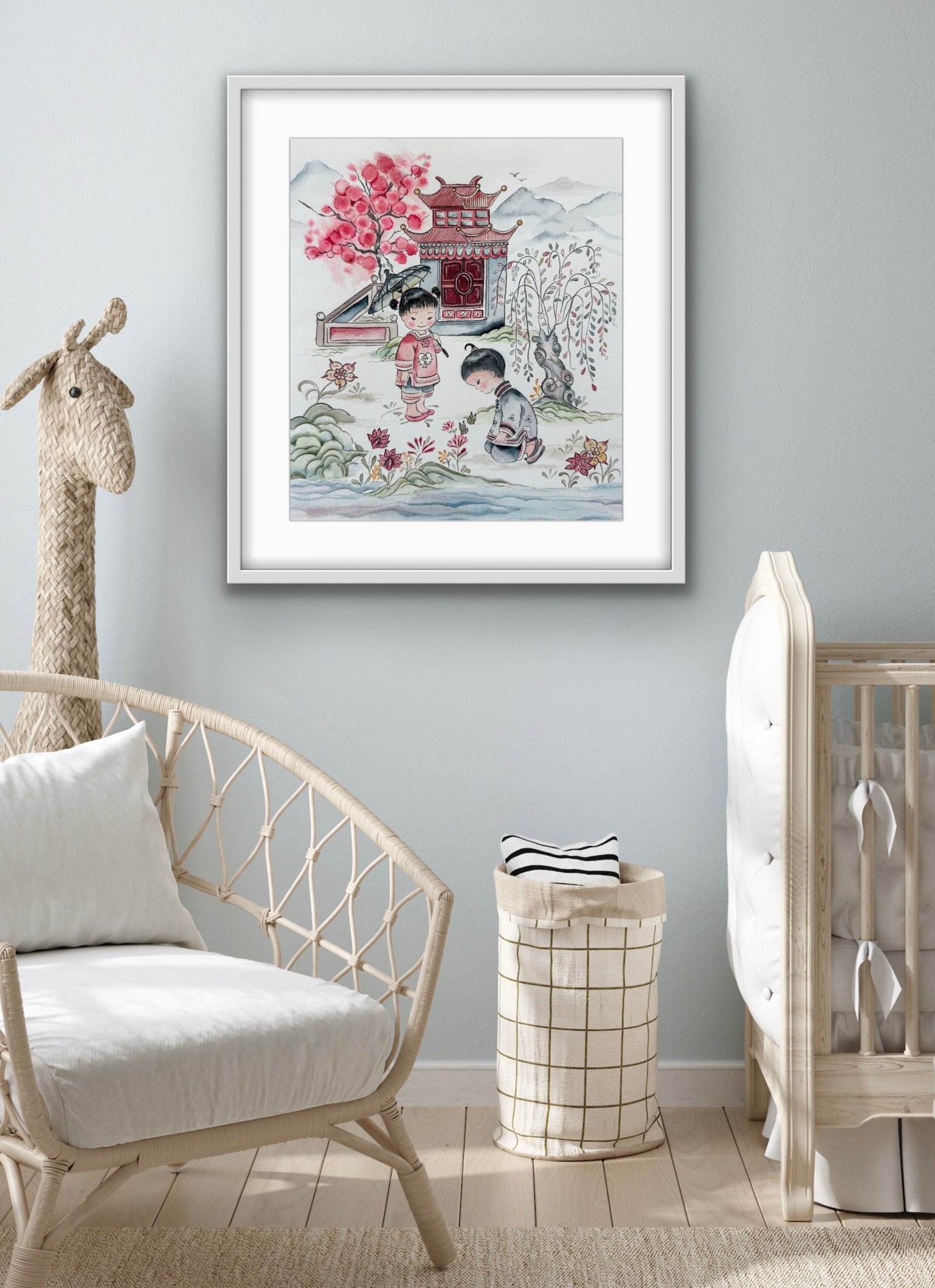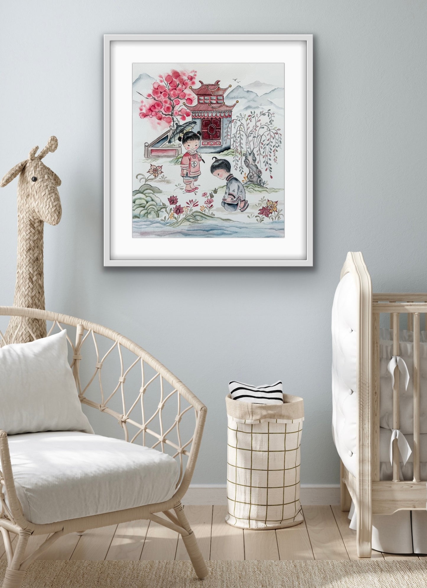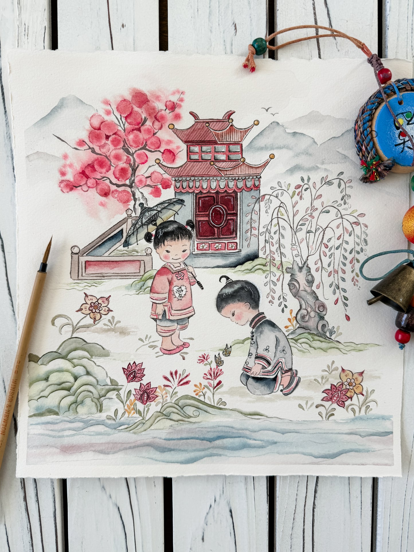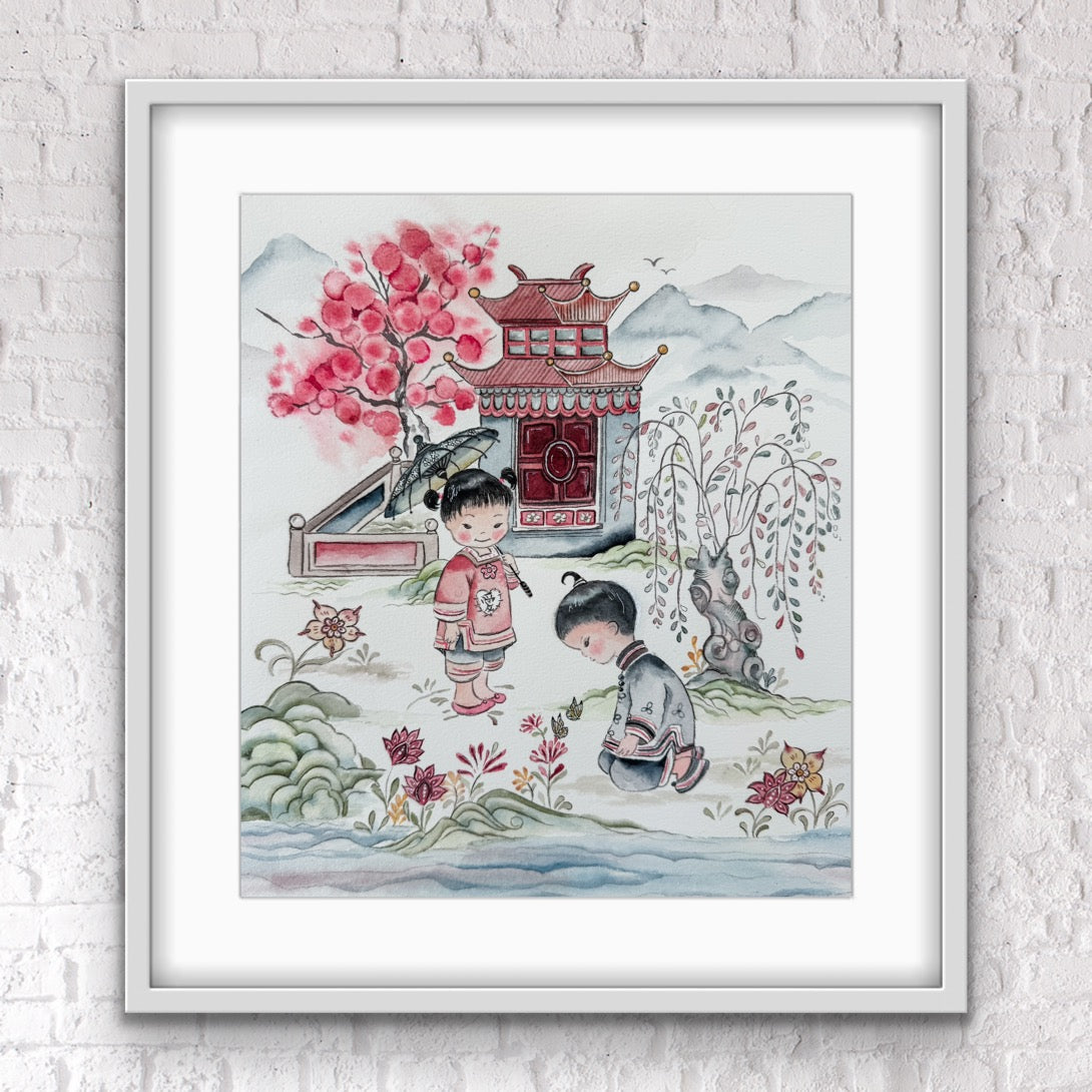 This is a reproduction of a beloved fabric within the Chinese adoption community. It is currently permanently out of print and I got permission from the fabric designer to paint some representational pieces from the original fabric design.