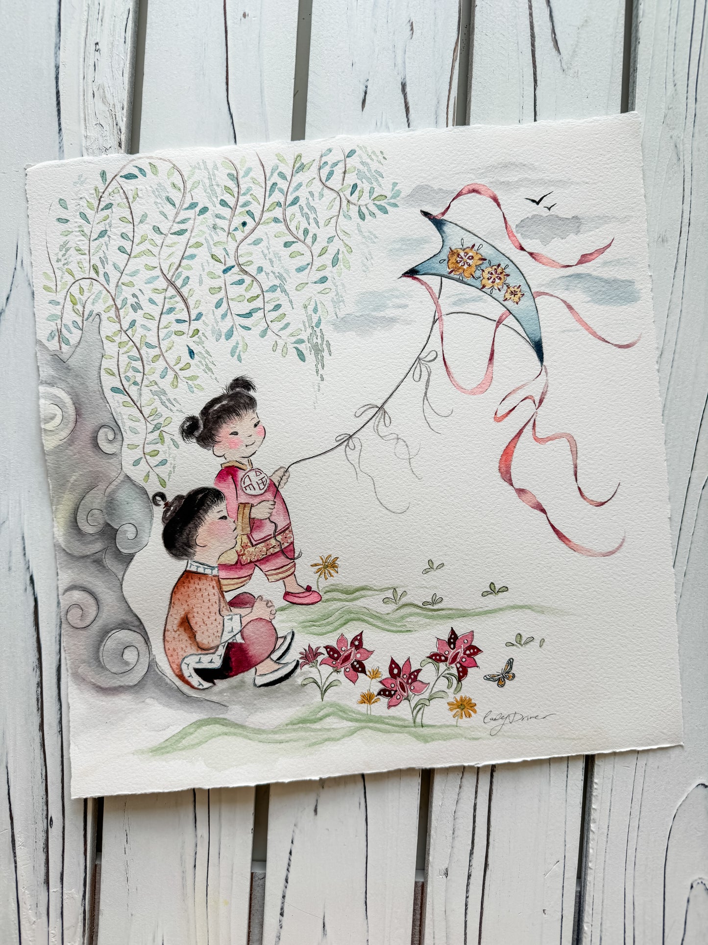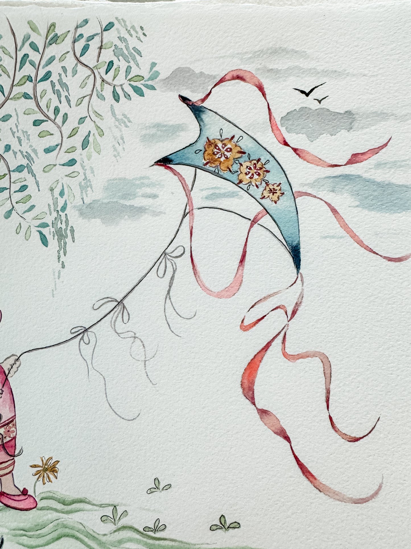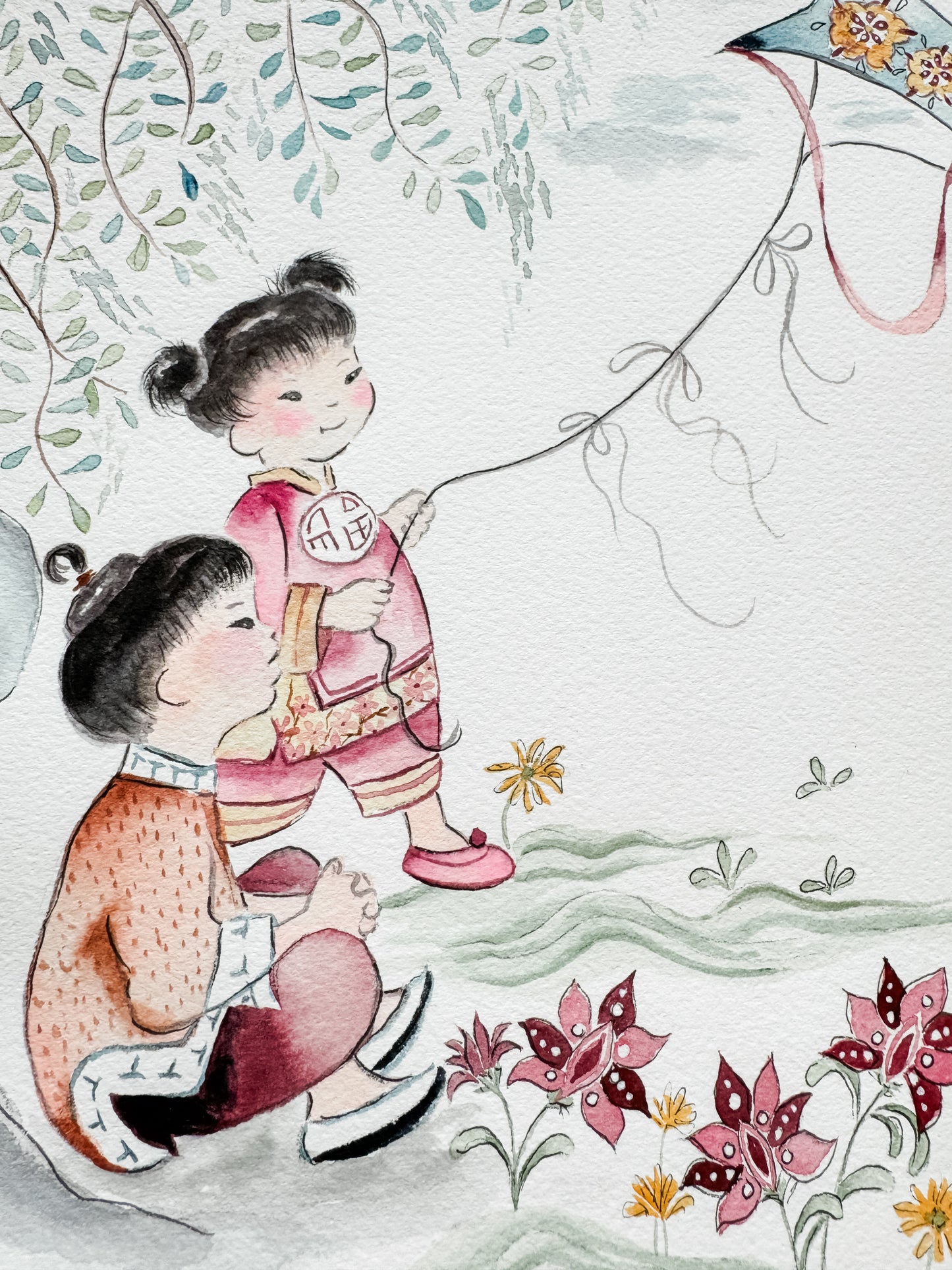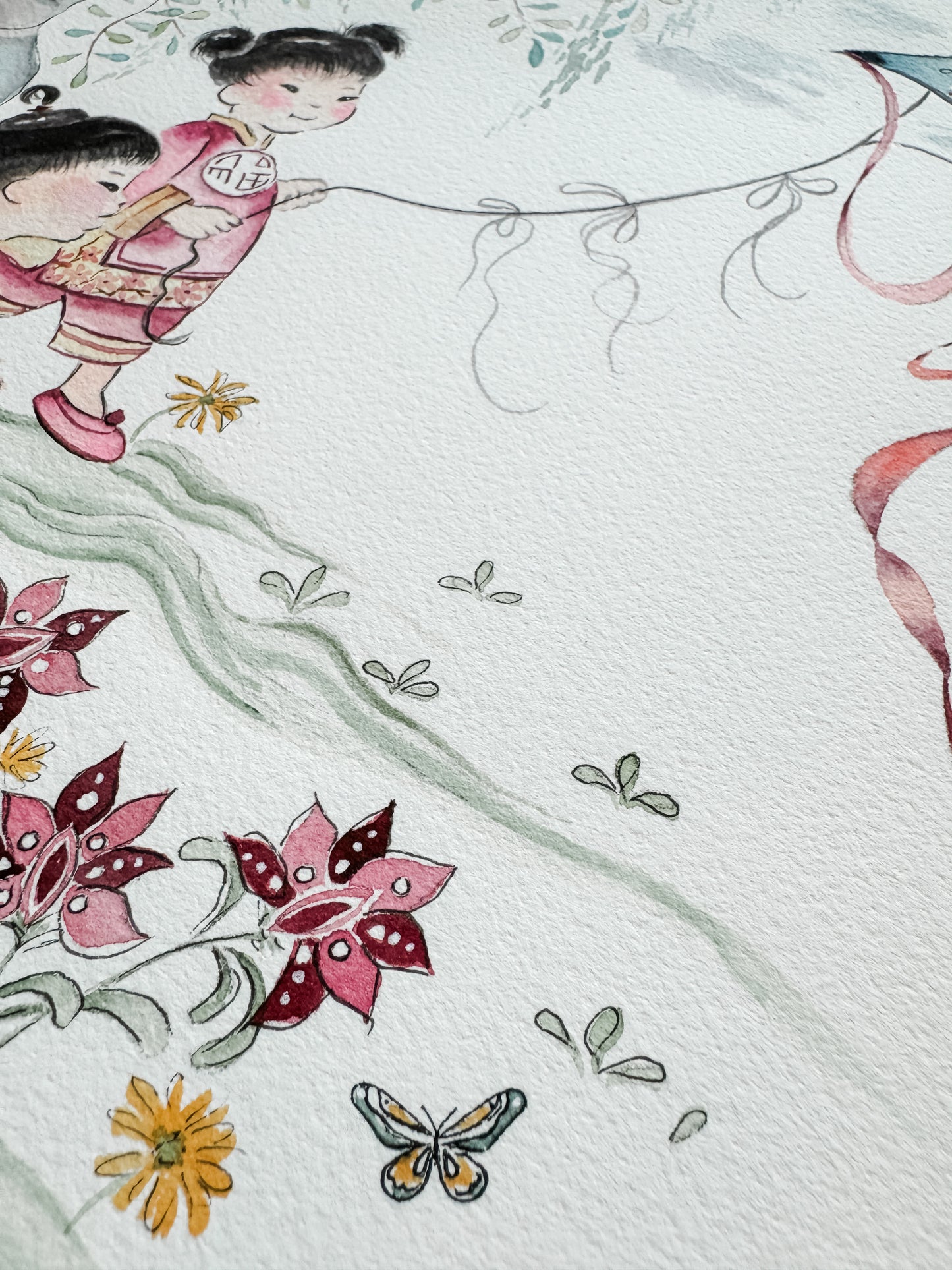 This is a reproduction of a beloved fabric within the Chinese adoption community. It is currently permanently out of print and I got permission from the fabric designer to paint some representational pieces from the original fabric design.