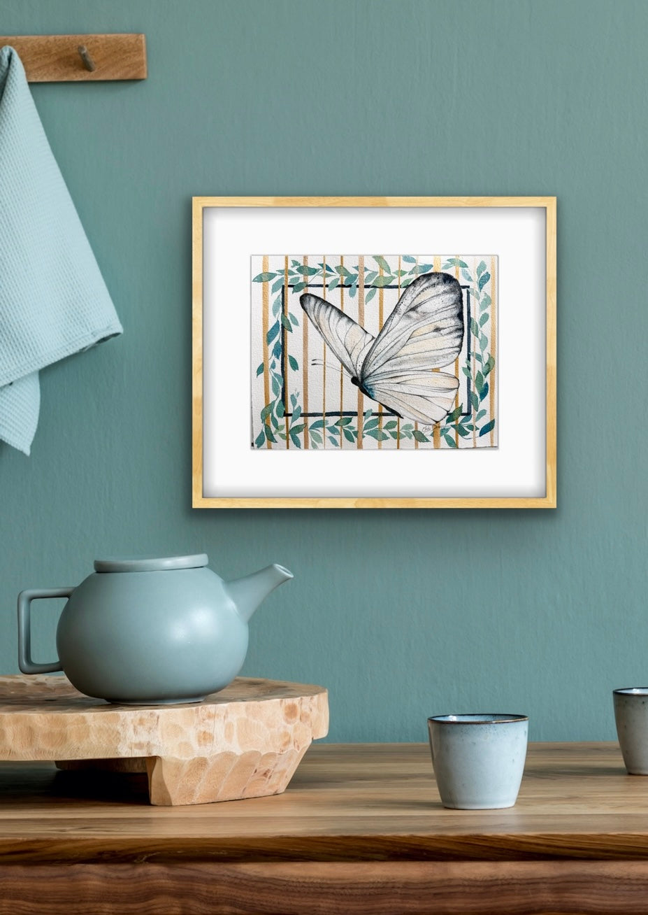 I'm constantly amongst the butterflies in my garden . I was inspired to capture this adorable white butterfly who seemed to not be afraid of me at all. This original watercolor is painted on Arches 140 lb cold press paper, with a gold striped background, accentuating a beautiful white cabbage butterfly, intertwined with vines.
