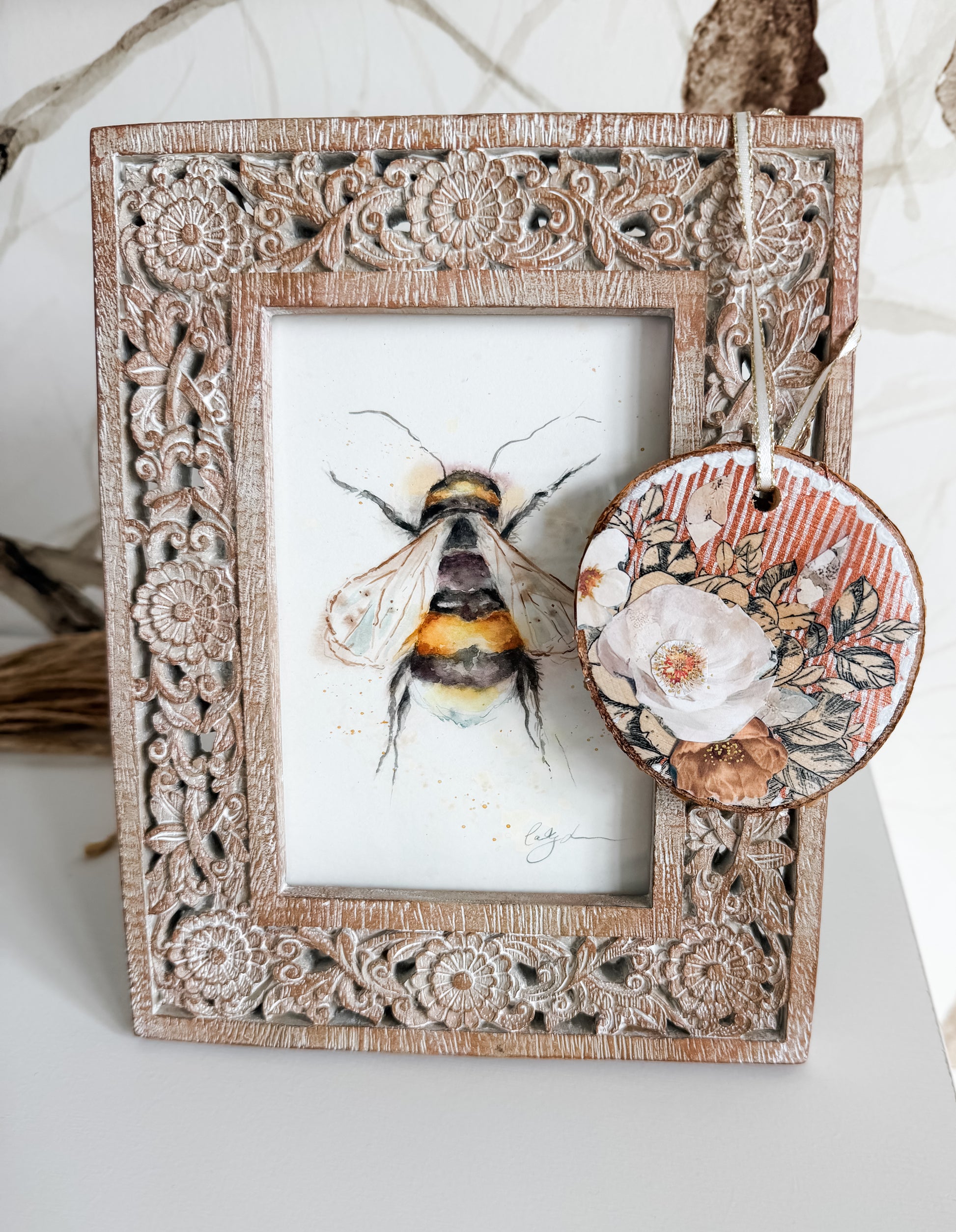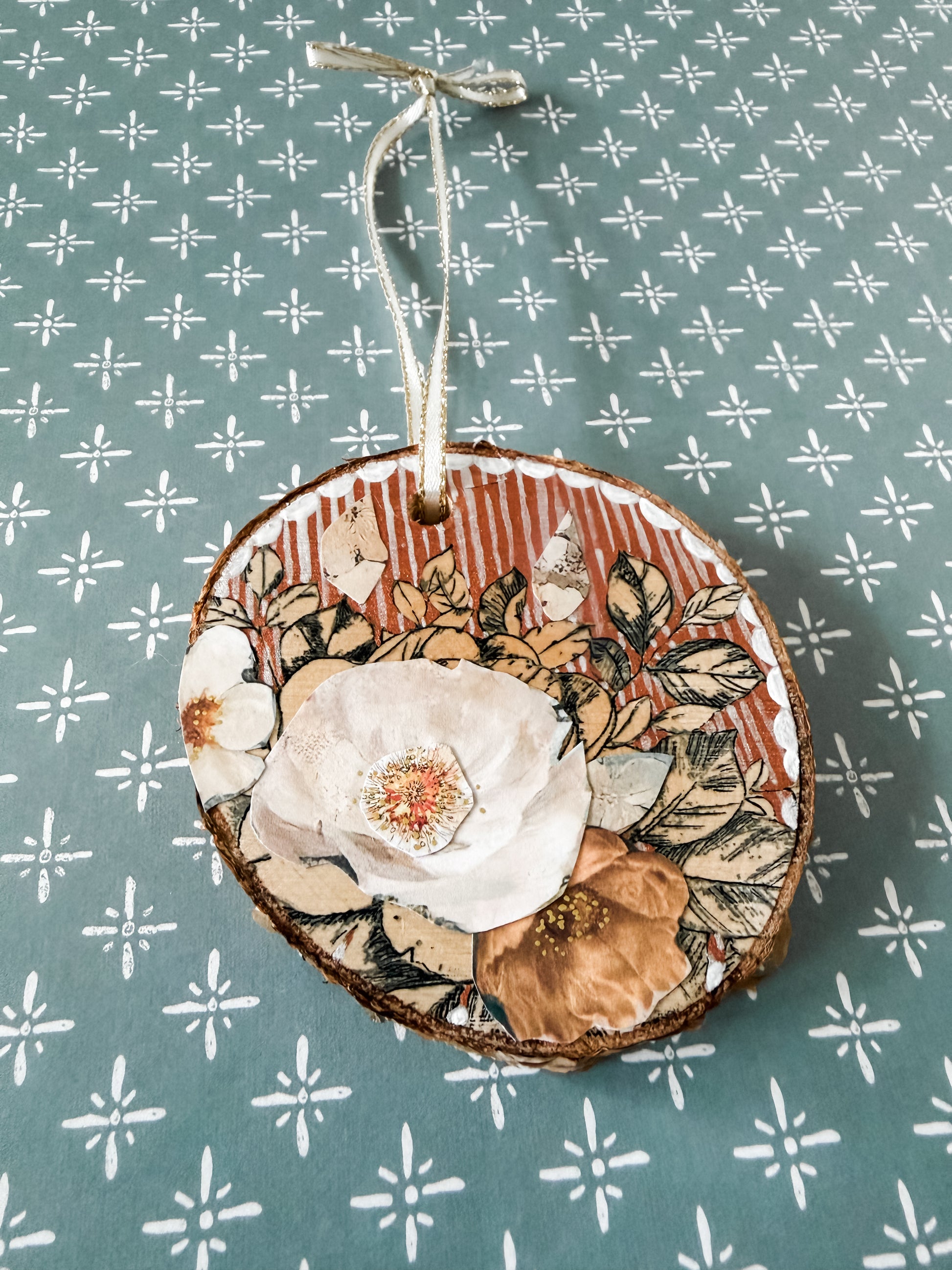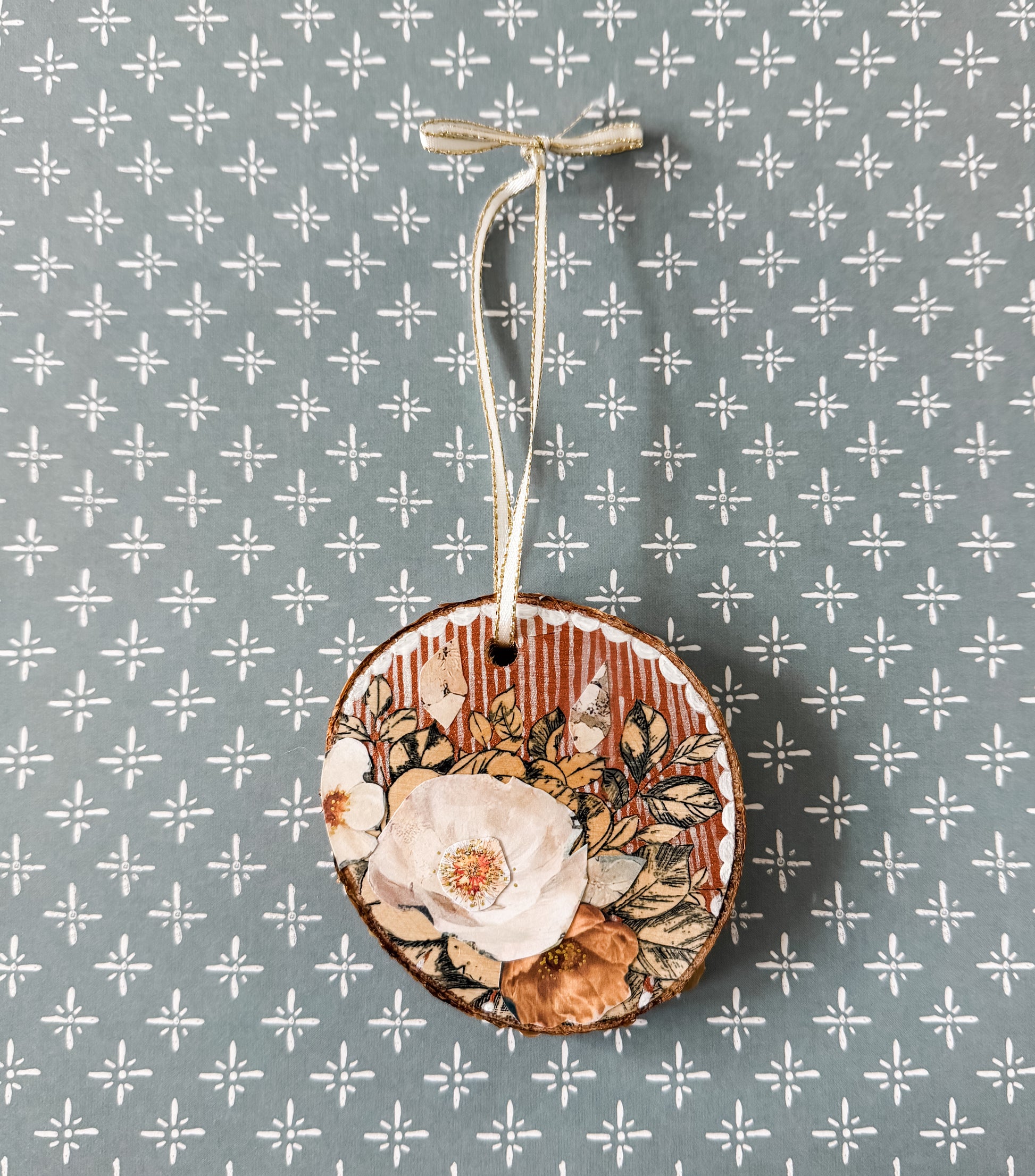 This is one of the smaller, more asymmetrical pieces of wood, but I loaded it up with layers and textures galore. I started with ink flowers and leaves, layered collage flowers, painting the background a rose gold, then layered shimmery silver stripes, then painted a scalloped edge before finishing it off with tiny golden dots in the centers of the roses!